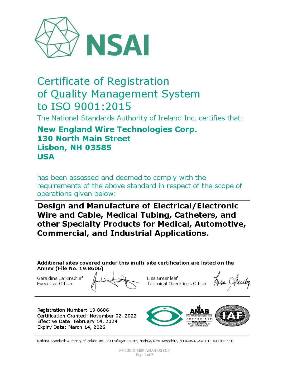 ISO 9001:2015 CertTo view the New England Wire Quality Manual, click below.